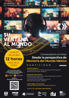 Se llevó a cabo la charla: Día Mundial del Patrimonio Audiovisual: consideraciones generales, en el Laboratorio de Archivos: Teoría y práctica de la gestión documental, organizado por el Instituto de Investigaciones Sociales de la Universidad Nacional Autónoma de México. El taller es coordinado por la Mtra. Saribel Cortés y la Mtra. Karina Villegas, y está dirigido para servidores públicos que realizan labores de archivo y gestión documental, y el público en general.